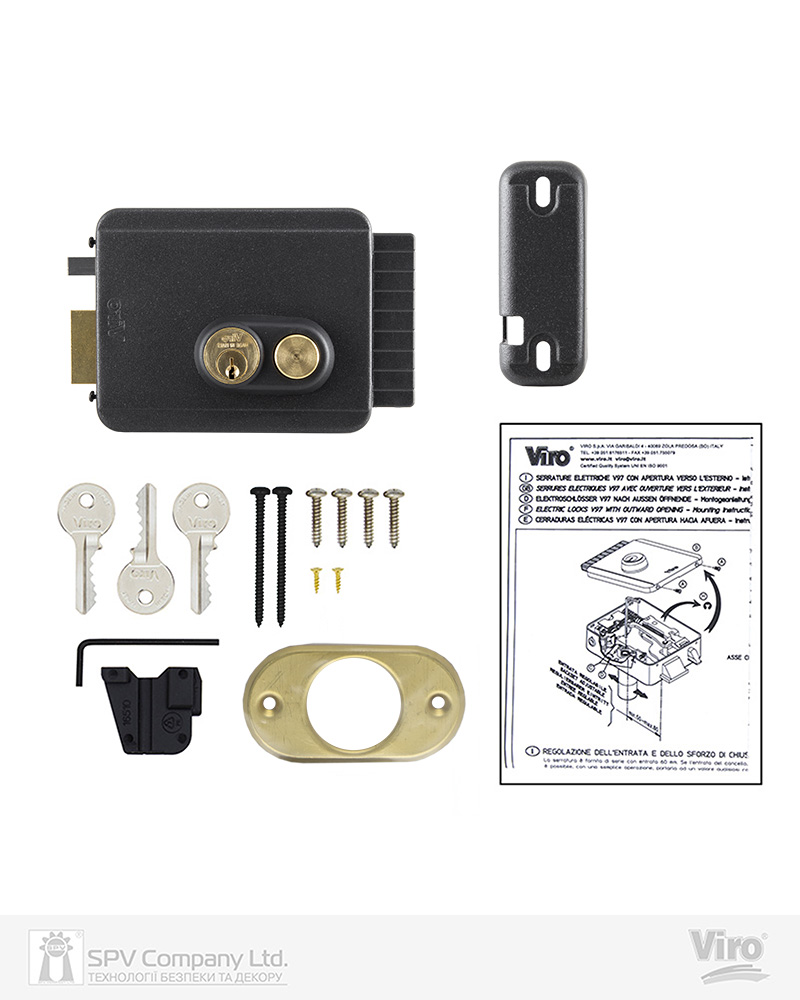 - корпус замка VIRO V97 моделі V8972.07942.2, запірна планка V8972.267, комплект пари циліндрів VIRO 791/794 спецпрофіля VIRO UN, фіксована ручка, внутрішня кнопка виходу, супортна овальна накладка на циліндр з кнопкою, зовнішня декоративна накладка на циліндр, електричні елементи замка, шестигранний ключ для регулювання виходу основного косого ригеля, монтажний комплект з елементами кріплення, паспорт-інструкція користувача, пакувальна упаковка.