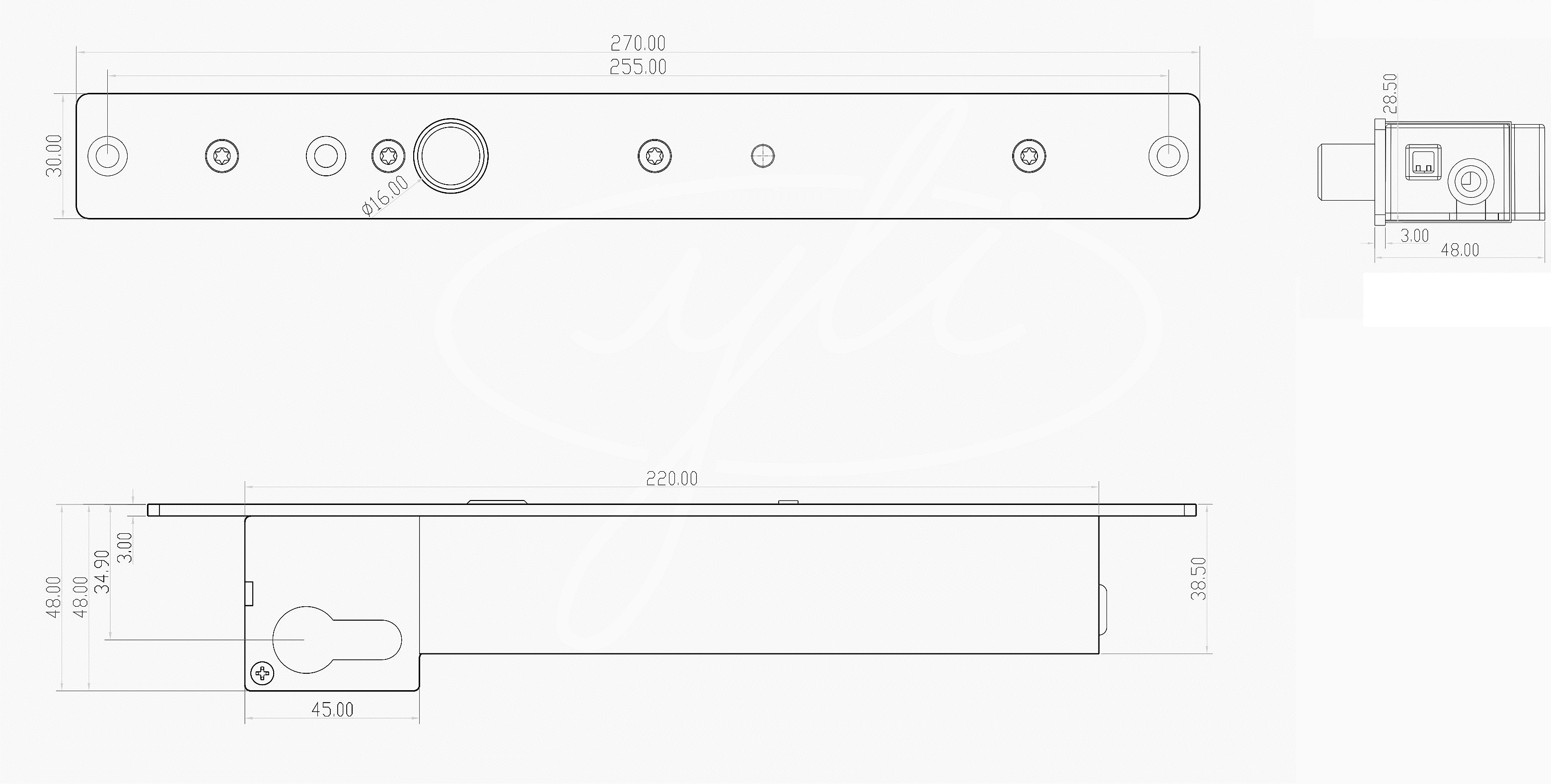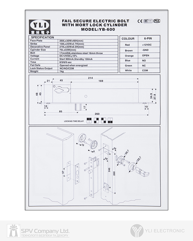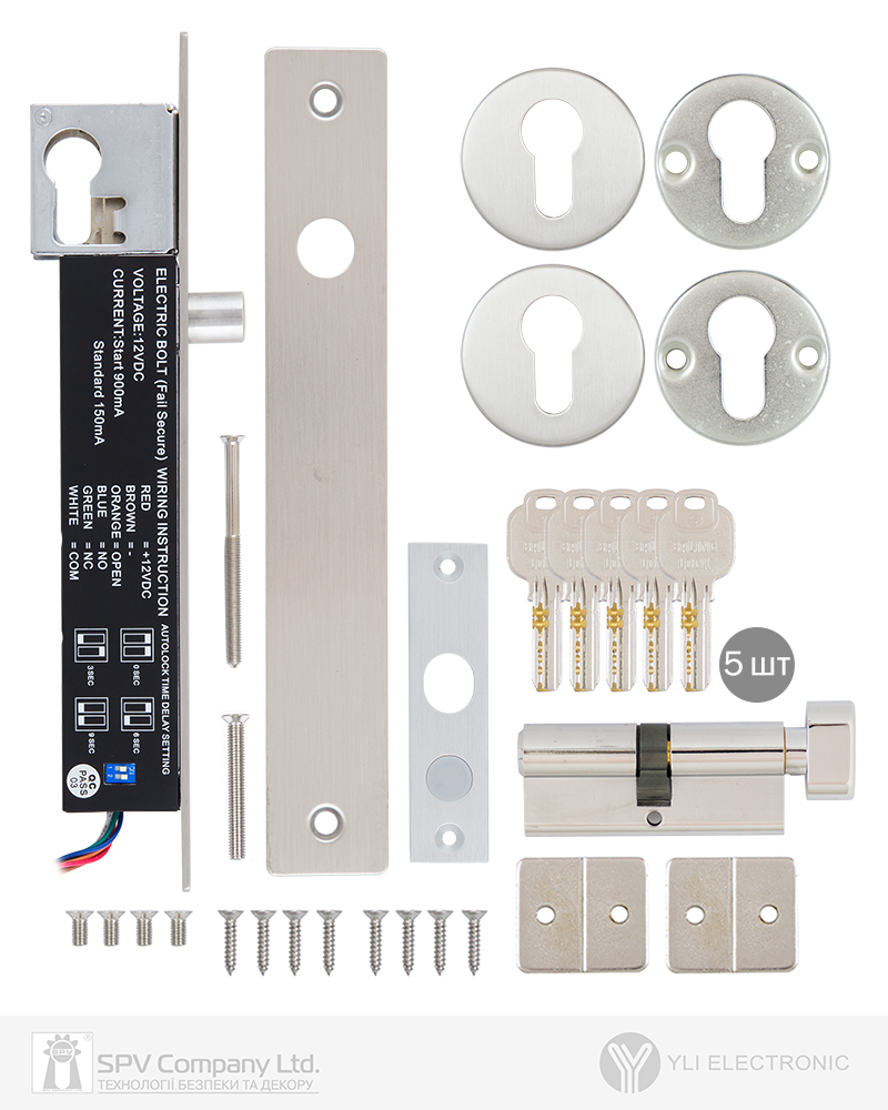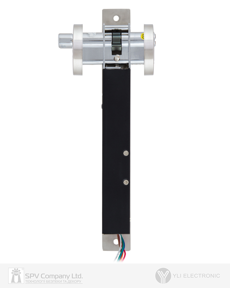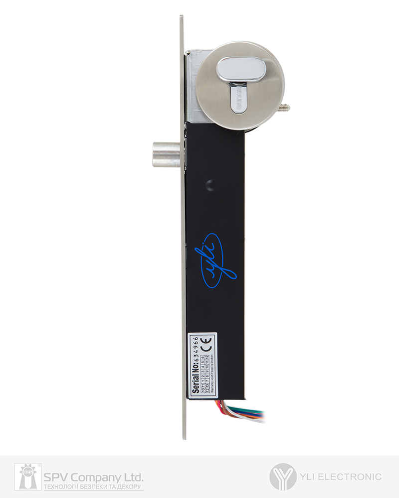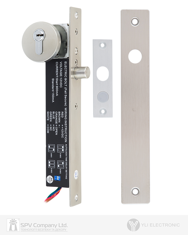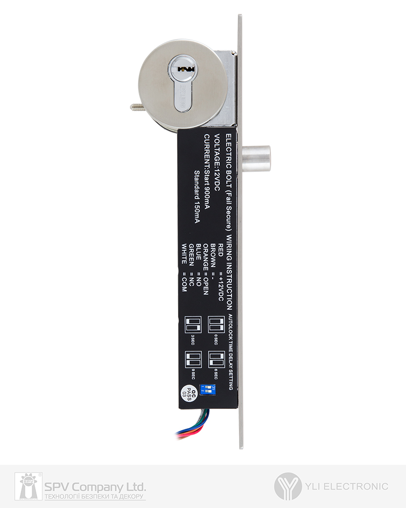 - Електричне керування: нормально замкнений (замкнений без живлення, відмикання поданням «-» (мінуса) на помаранчевий дріт, за умови подання живлення на ригель). Постійно подане живлення не дає можливості тримати ригель відкритим постійно. Безумовне закриття через 9 секунд.