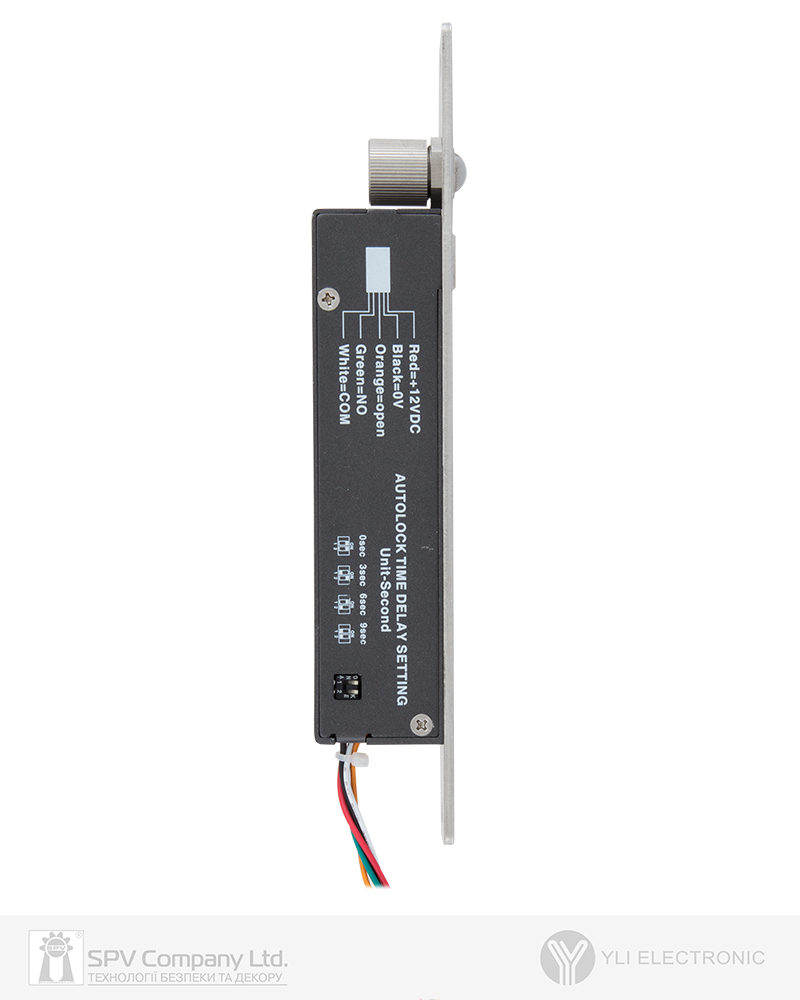 - Електричне керування: нормально замкнений (після подачі живлення відмикаається і замикається тільки при наявності зворотної планки з магнітом навпроти замку, відмикання поданням «-» (мінуса) на помаранчевий дріт)