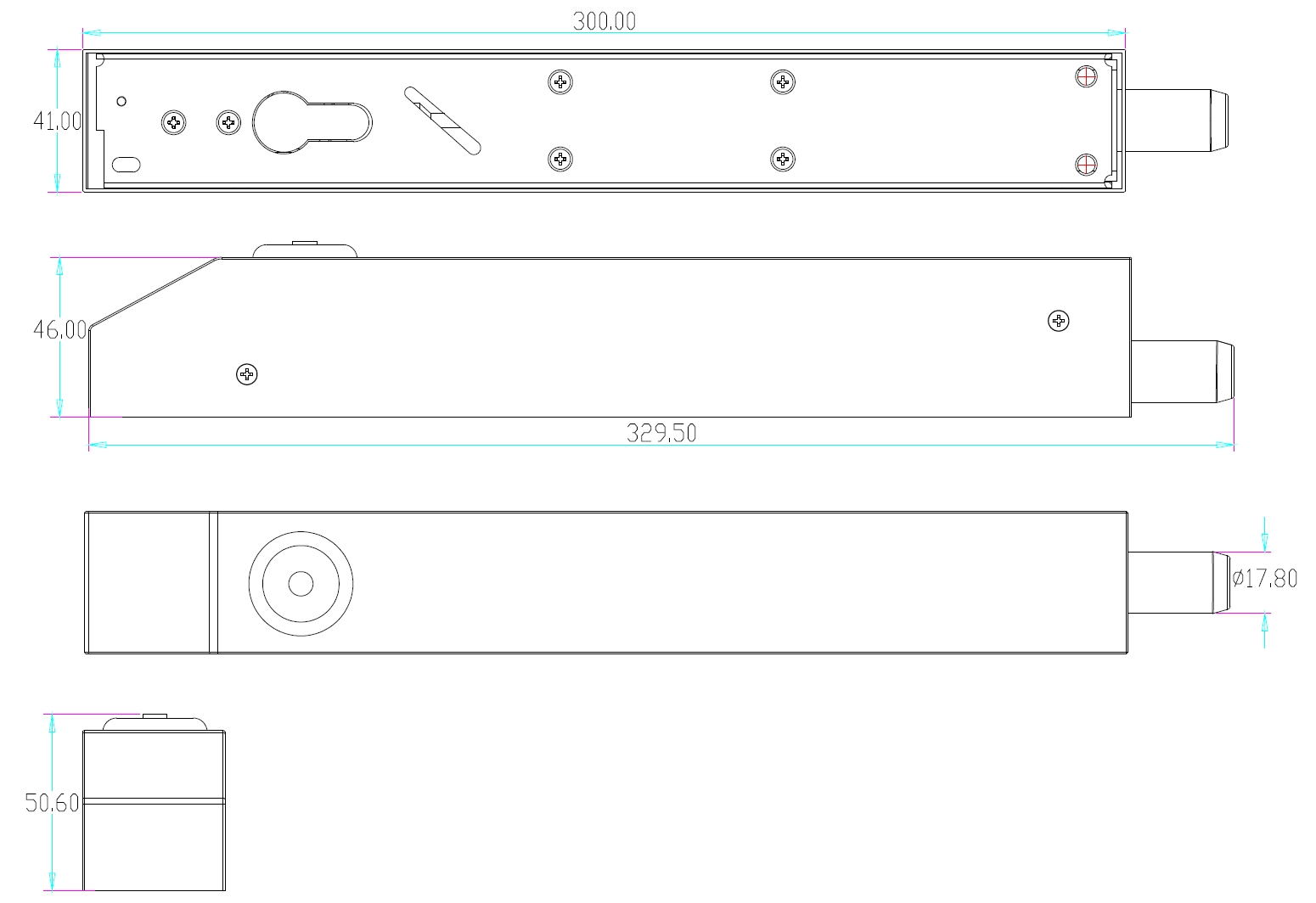 - Розміри: (висота х ширина х глибина), мм: 329,5 х 41 х 46
