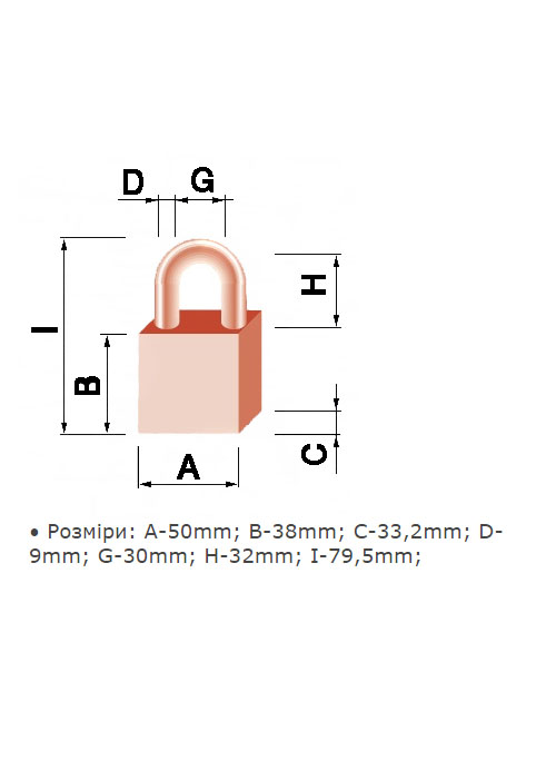 • Розміри: A-50mm; B-38mm; C-33,2mm; D-9mm; G-30mm; H-32mm; I-79,5mm;