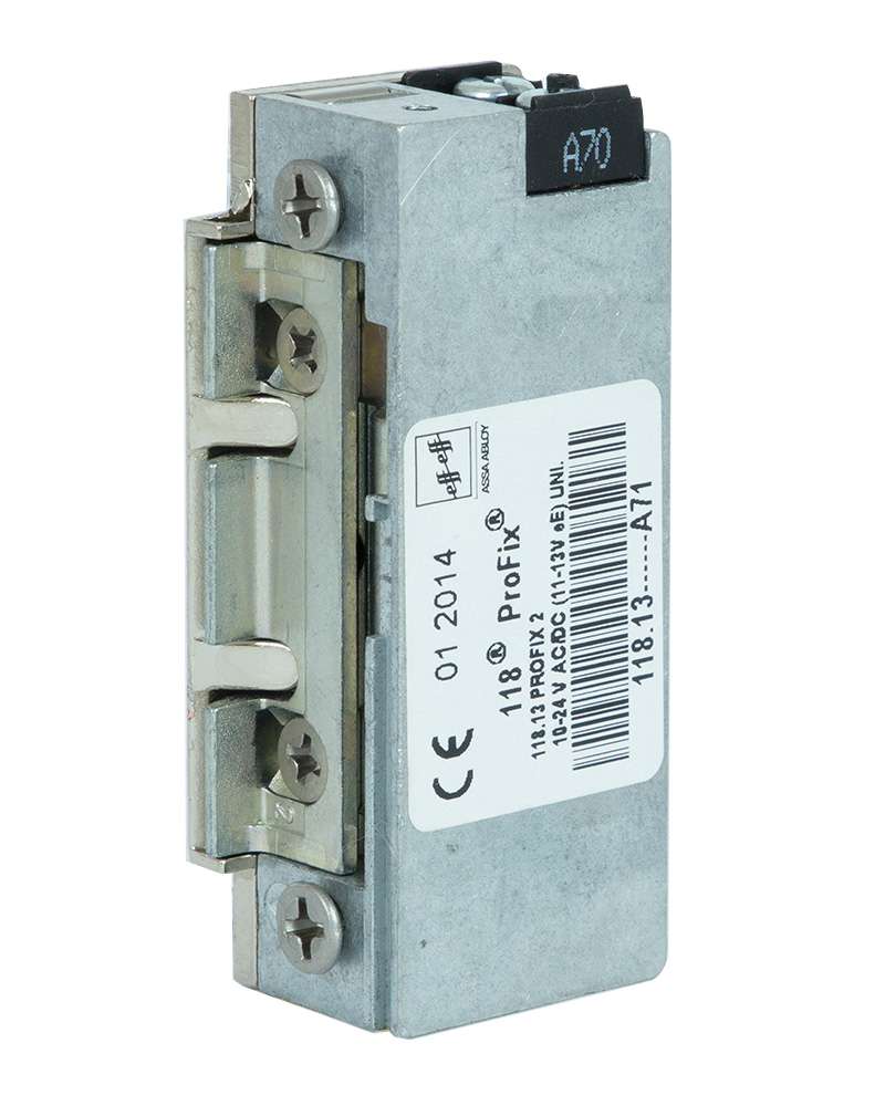 Защіпки електромеханічні з технологією Profix2 серії 118.13/128.13/138.13 є найменшими у світі за розмірами стандартними універсальними електромеханічними защіпками. ProFix – це поєднання дверної заскочки з регулюванням язичка FaFix та інтегрованої направляючої для косої заскочки замка, що кріпиться безпосередньо до корпуса защіпки. Завдяки радіальному язичку та інтегрованої направляючій защіпки Profix2 серії 118.13 можуть бути встановлені у металеві, дерев’яні та профільні двері з мінімальною відстанню від косого язичка механічного замка до краю рами всього 4 мм. Сумісні з більшістю стандартних врізних замків.