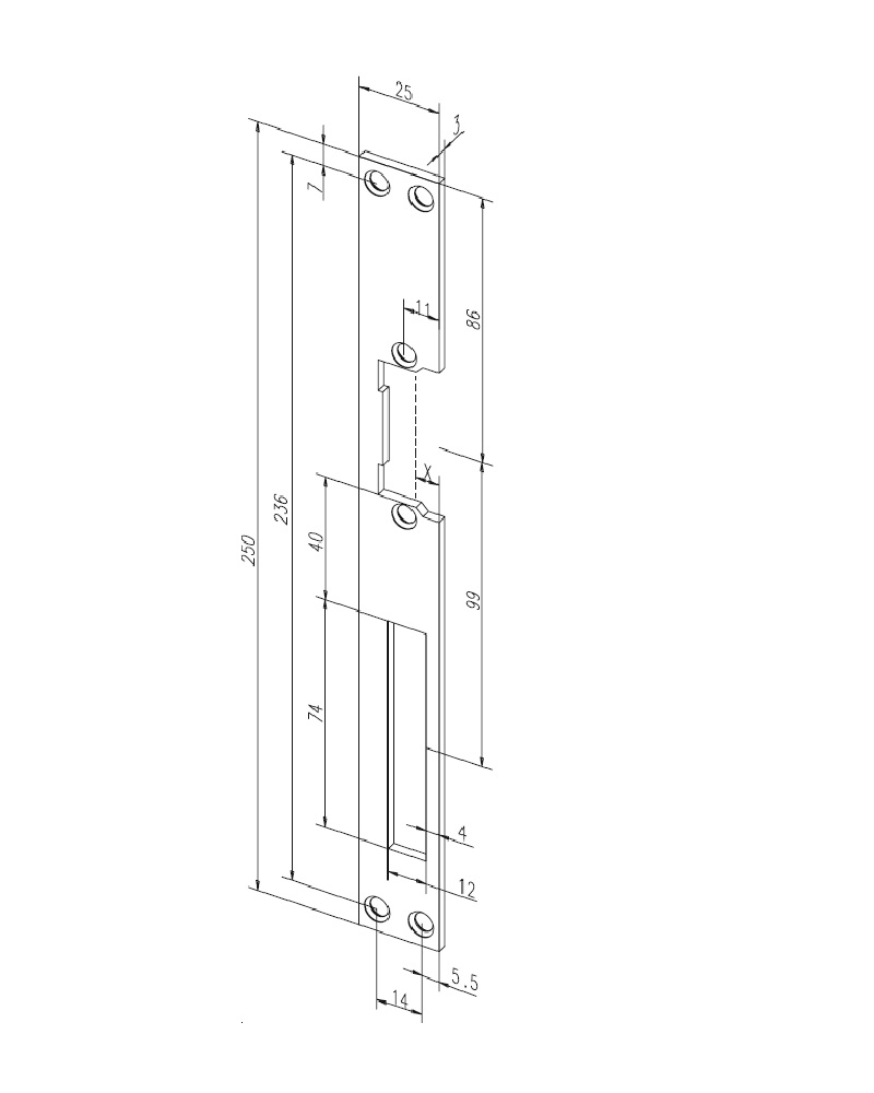 Довга зворотна планка з отвором для основного ригеля замка вхідних або міжкімнатних дверей.. Призначена для встановлення електромеханічних защіпок у дерев’яні та металеві рами прямих дверей та дверей з притвором. Сумісна з усіма стандартними електромеханічними защіпками EFF EFF (серій Е7, 118, SPE73, SPE).