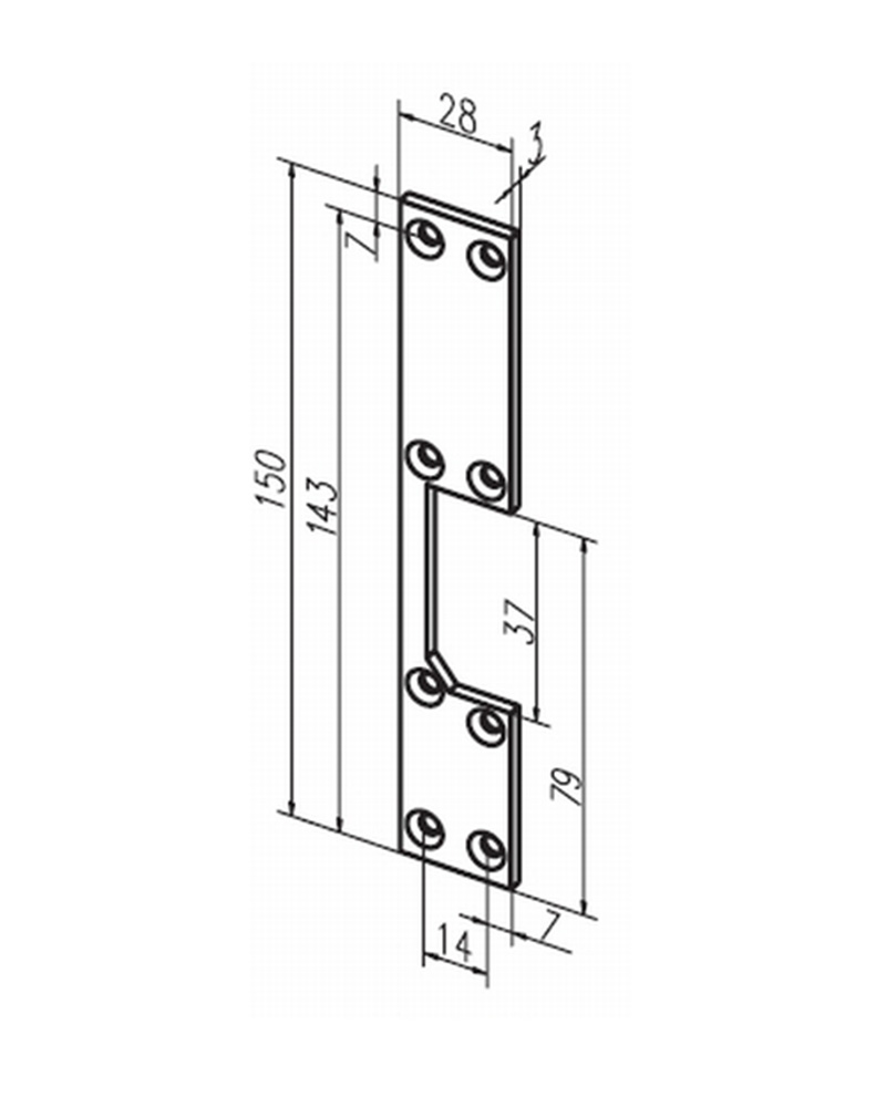 Спеціальна коротка зворотна планка без отвору для основного ригеля замка.для електромеханічних защіпок серії 115/125. Призначена для встановлення електромеханічних защіпок у дерев’яні та металеві рами прямих дверей та дверей з притвором.