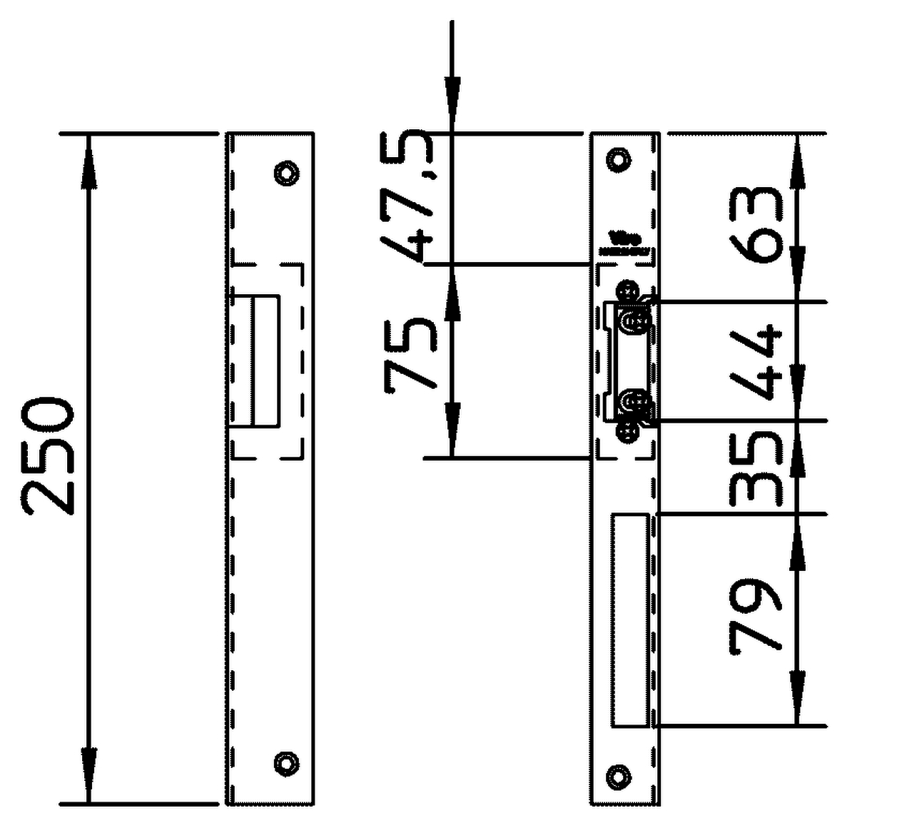Довга кутова зворотна планка з отвором для основного ригеля замка. Призначена для встановлення електромеханічних защіпок у дерев’яні рами. Сумісна з усіма електромеханічними защіпками VIRO та іншими.