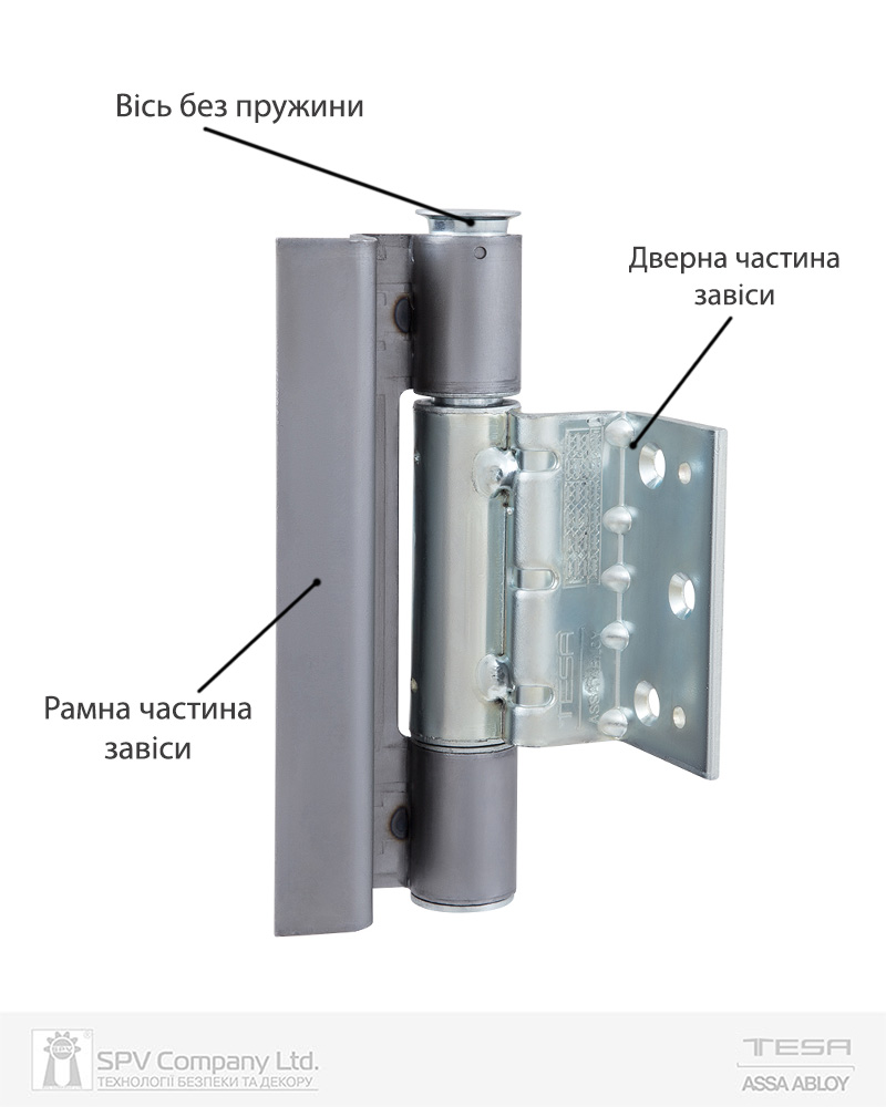 Рамна частина – без декоративного покриття, для приварювання до рами двері (мається на увазі подальше фарбування разом з дверною коробкою), дверна частина – оцинкована, для кріплення на метизи.